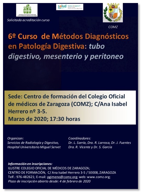 Estimados compañeros, os adjuntamos información sobre el 6º Curso de Métodos Diagnósticos en Patología Digestiva, dedicado en esta edición a tubo digestivo, mesenterio y retroperitoneo, que organizan nuestros compañeros de los Servicios de Radiología y Digestivo del Hospital Universitario Miguel Servet de Zaragoza.